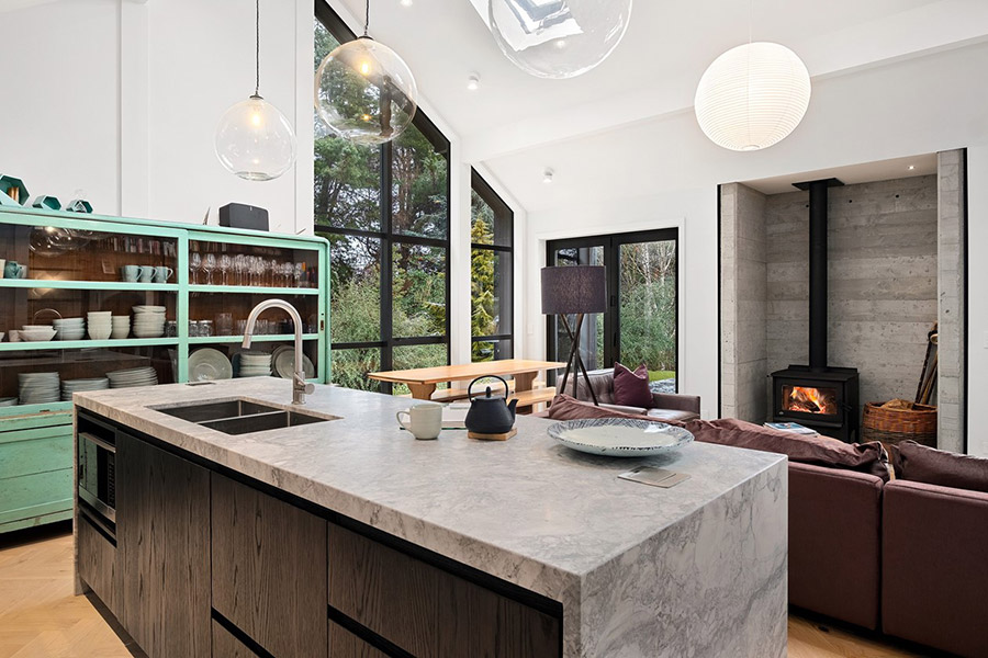 The CWW team worked on the interiors for this project – including the bespoke oak kitchen joinery, floating lounge room timber shelving and the custom bathroom vanity units, also crafted from solid oak.